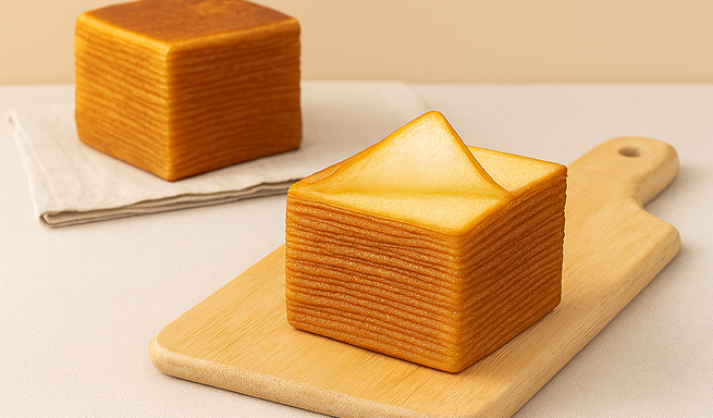 Folded dough baked in cube form, offering both visual appeal and rich texture.
